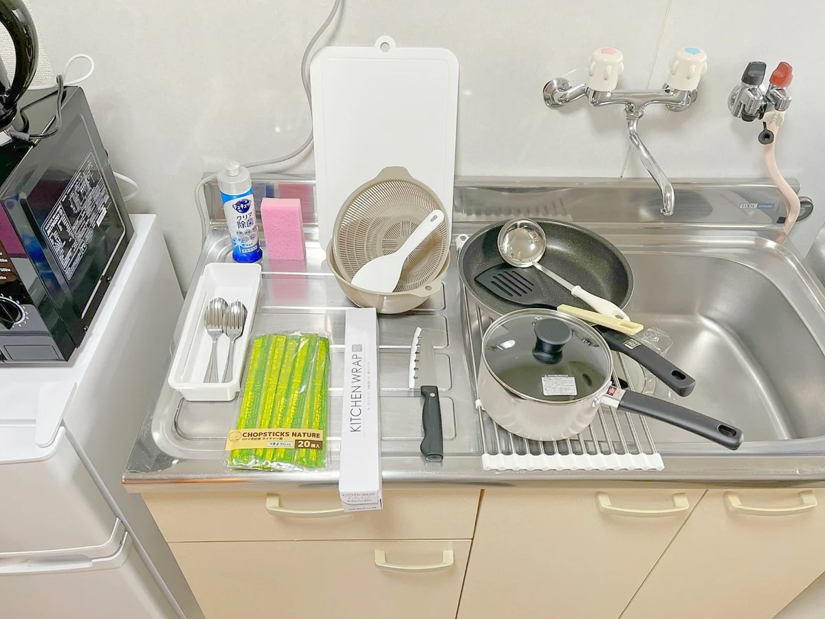 全身鏡・TVボード・リモコン立て・卓上ミラー・食器類・調理器具類・食器用洗剤・食器用スポンジ・ハンガー・パラソルハンガー ・ダストボックス・ティッシュペーパー・靴ベラ・照明・デジタル時計・テレビアンテナケーブル・延長コード・マットレス・バスマット・タオル(大・小) ・トイレットペーパー・トイレ用洗剤・バス用洗剤 ・シャンプー ・リンス・ ボディソープ ・トイレ用ブラシ ・トイレ用ダストボックス・ wifiルーター・ラグ